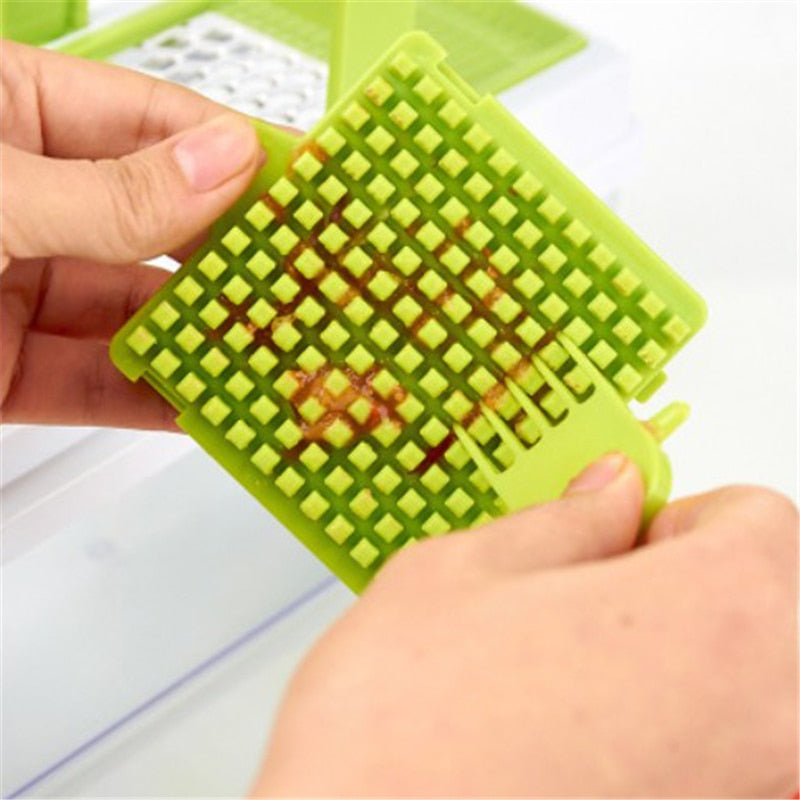 Picar las cebollas, calabacines, pimientos, apio, tomates, huevos duros, queso, frutas y luego ver como la transferencia de ingredientes pasa instantáneamente a la superficie de corte al recipiente de abajo.